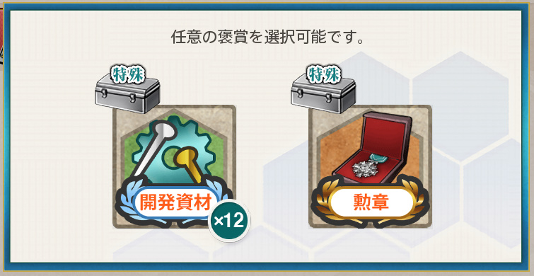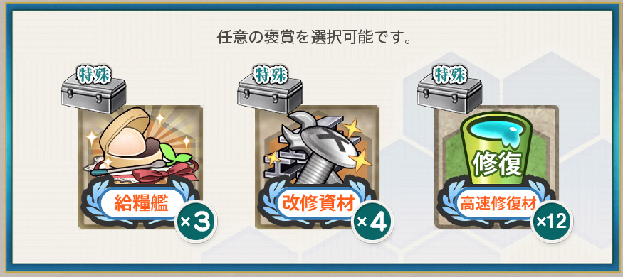 - 給料艦×3 or 改修資材×4 or 高速修復材×12
