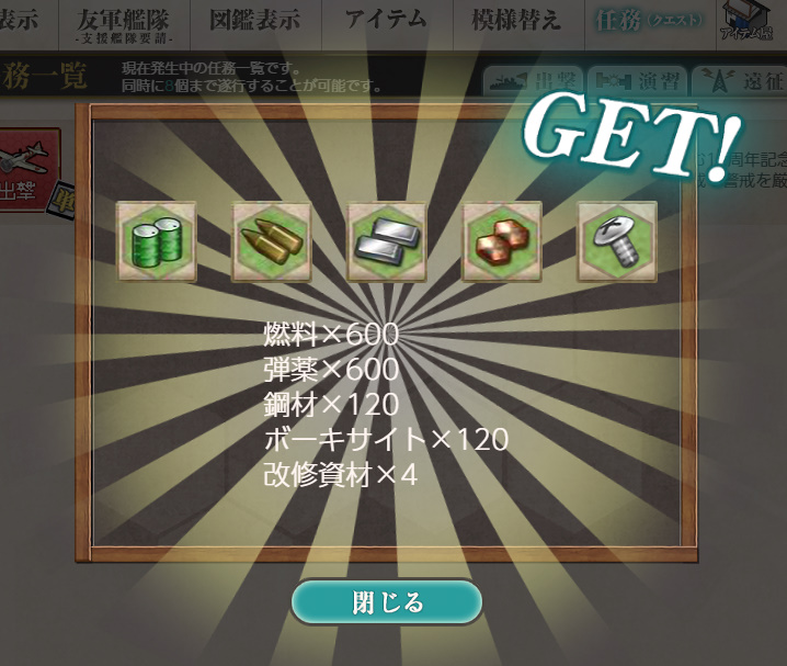 - 燃料×600、弾薬×600、鋼材×120、ボーキサイト×120