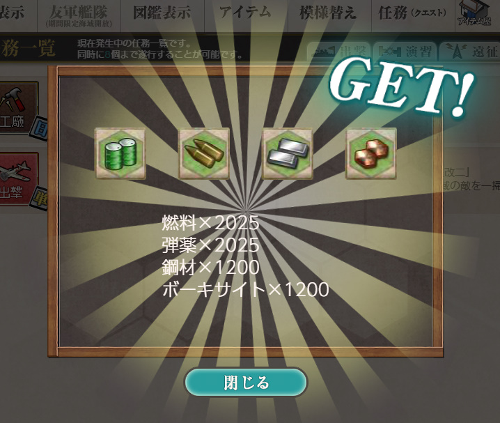 - 燃料×2025、弾薬×2025、鋼材×1200、ボーキサイト×1200