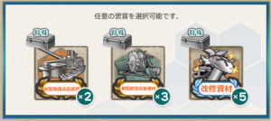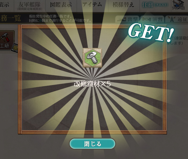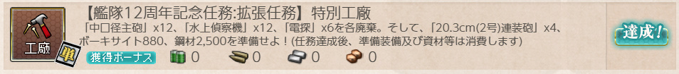艦これ 任務「【艦隊12周年記念任務】特別工廠」【工廠/期間限定/単発】 Posted on 2025年8月26日 by miyagi 2025年4月23日実装の期間限定任務です 春イベント開催中に実装された 艦隊十二周年記念任務です 任務内容 中口径主砲×12、水上偵察機×12、電探×6を廃棄し 「20.3cm(2号)連装砲」×4、 ボーキサイト880、鋼材2500を用意する ※装備等は任務達成時使用します 任務報酬 新型砲熕兵装資材×2 or 新型航空兵装資材×3 or 改修資材×5 試製20.3cm(4号)連装砲 or 203mm/53連装砲★+4 ×3 改修資材と4号砲をいただきました 以下スクショ
