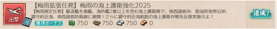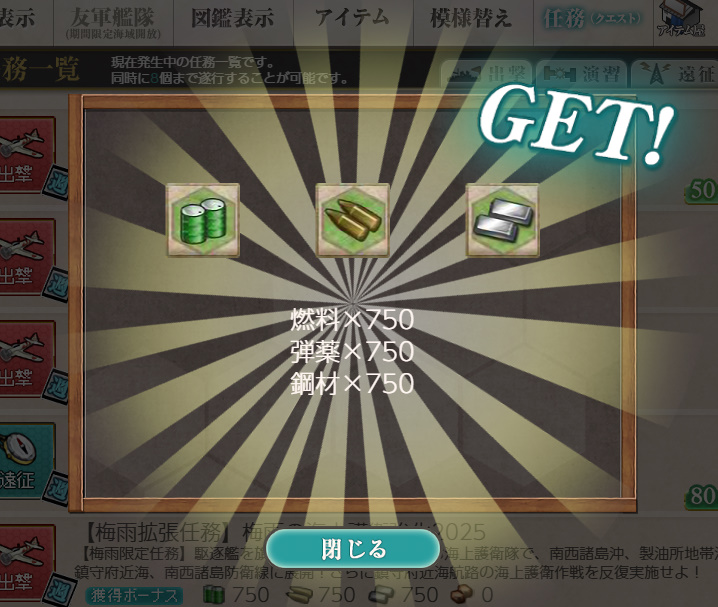 - 燃料×750、弾薬×750、鋼材×750、ボーキサイト×0