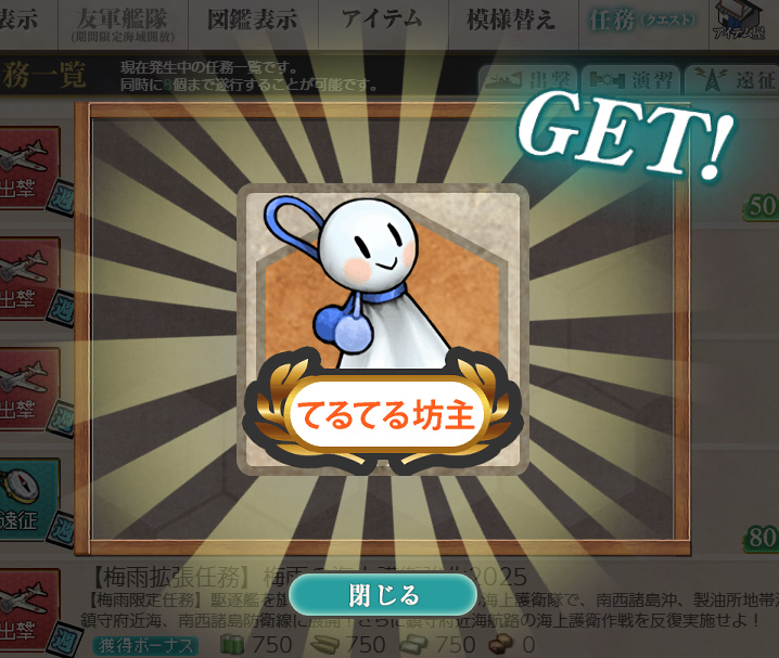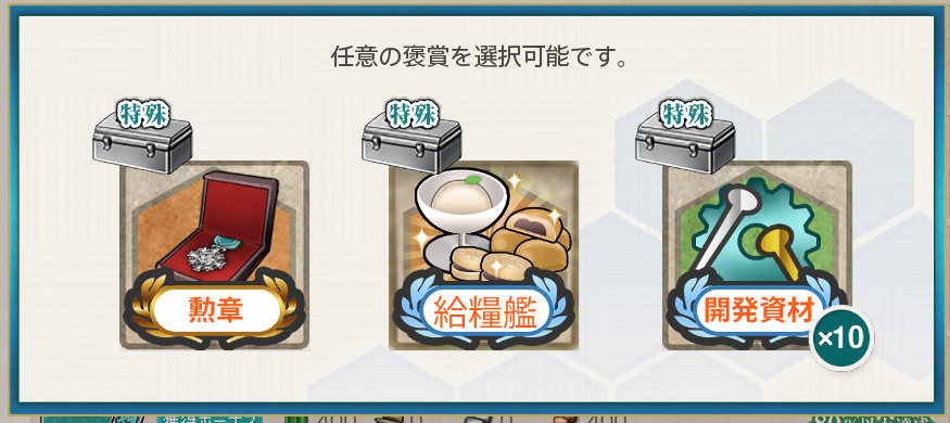 - 勲章 or 給料艦「間宮」 or 開発資材×10