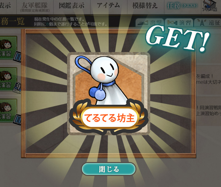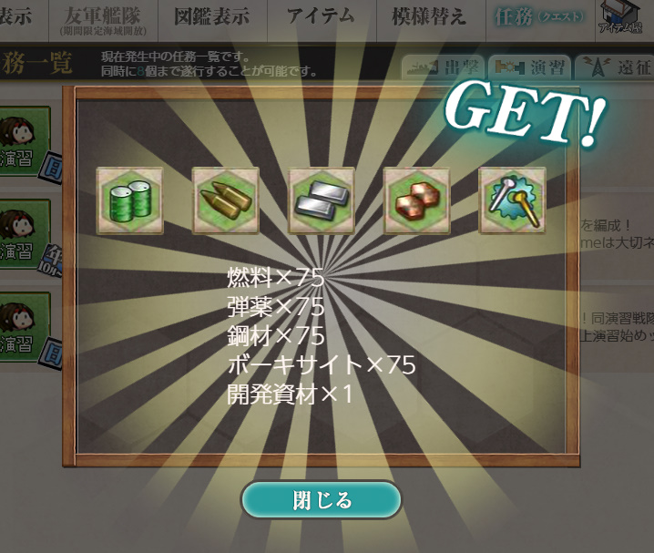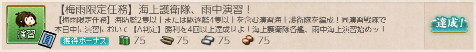 艦これ 任務 「【梅雨限定任務】海上護衛隊、雨中演習!」【期間限定/演習/デイリー】 Posted on 2025年9月2日2025年9月28日 by miyagi 2025年5月30日実装の任務です 任務内容 海防艦2隻以上または駆逐艦4隻以上を含む艦隊で 同日中に演習でA勝利以上を4回達成する 任務報酬 燃料×75、弾薬×75、鋼材×75、ボーキサイト×75 開発資材×1 てるてる坊主×1 以下スクショ
