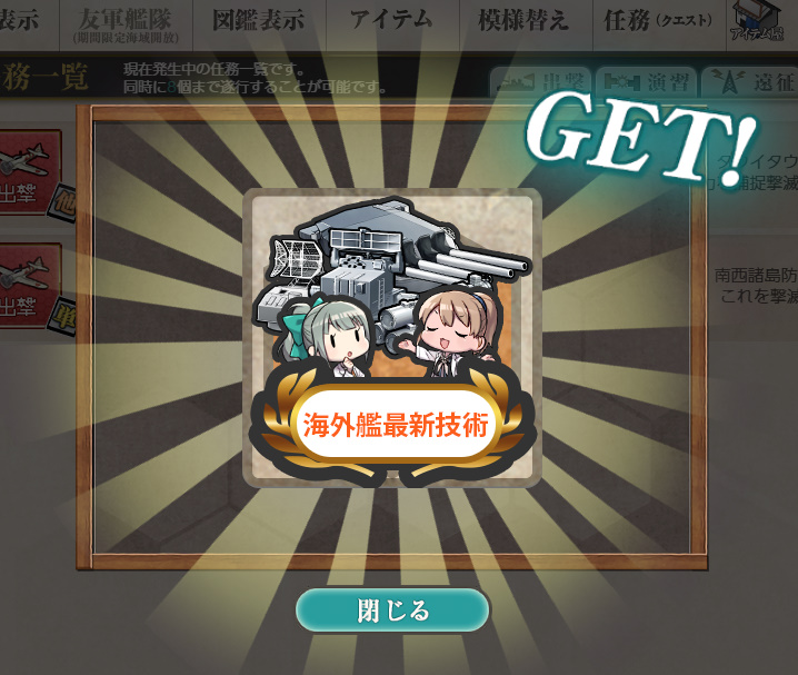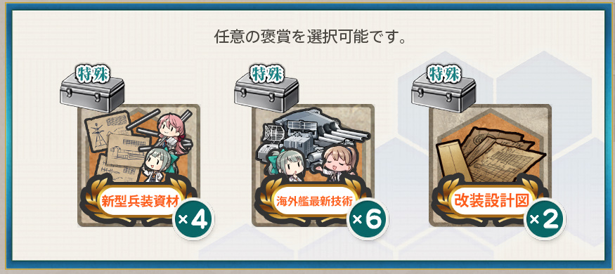 - 新型兵装資材×4 or 海外艦最新技術×6 or 改装設計図×2