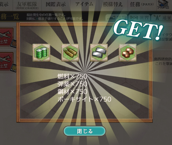 - 燃料×750、弾薬×750、鋼材×750、ボーキサイト×750