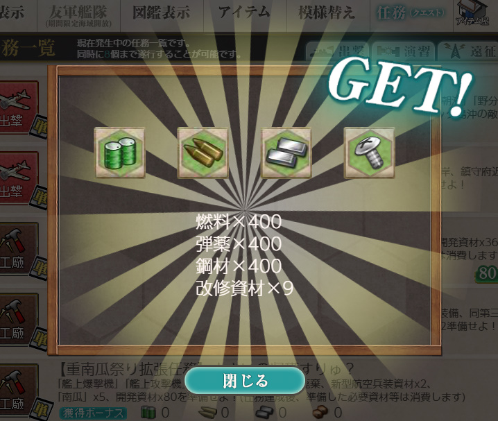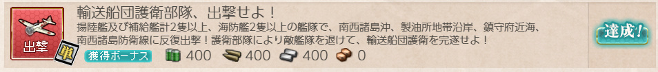 - 燃料×400、弾薬×400、鋼材×400、ボーキサイト×0