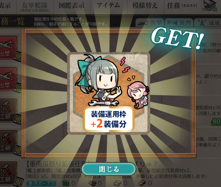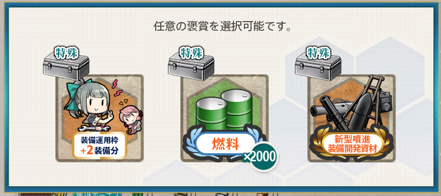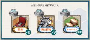 - 装備運用枠+2装備分 or 燃料×2000 or 新型噴進装備開発資材
