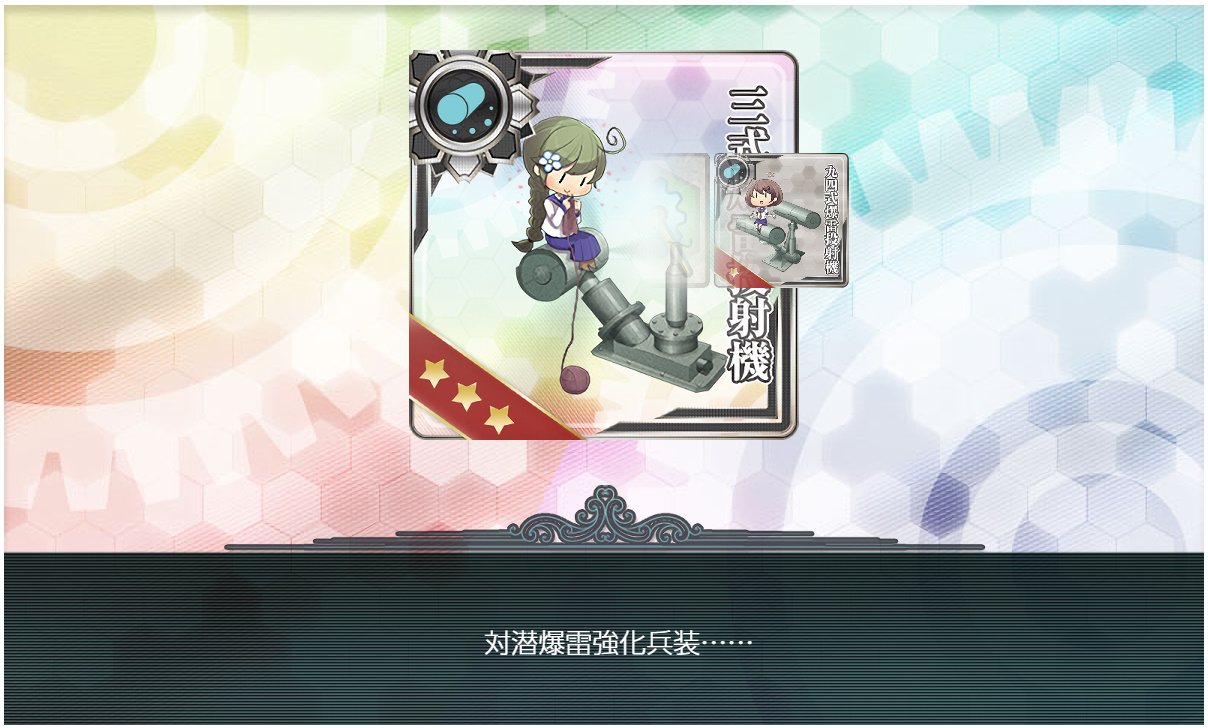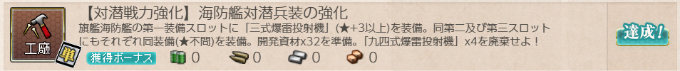 艦これ 任務「 【対潜戦力強化】海防艦対潜兵装の強化」【工廠/単発】 Posted on 2025年9月28日 by miyagi 2025年7月26日に実装された単発任務です 任務内容 旗艦に配置した海防艦の第一スロットに三式爆雷投射機(★+3以上)を 第二、第三スロットに同じく三式爆雷投射機(★不問)を装備し、 開発資材×32を用意し、 九四式爆雷投射機×4を廃棄する ※装備等は任務達成時使用します 任務報酬 三式爆雷投射機 集中配備 以下スクショ
