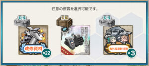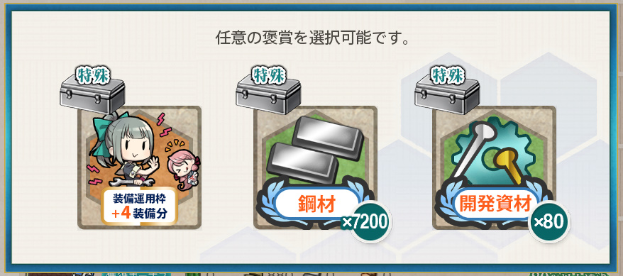 - 装備運用枠+4装備分 or 鋼材×7200 or 開発資材×80