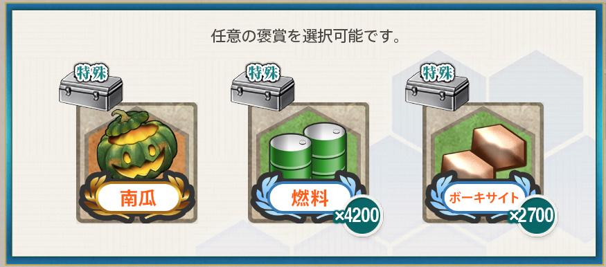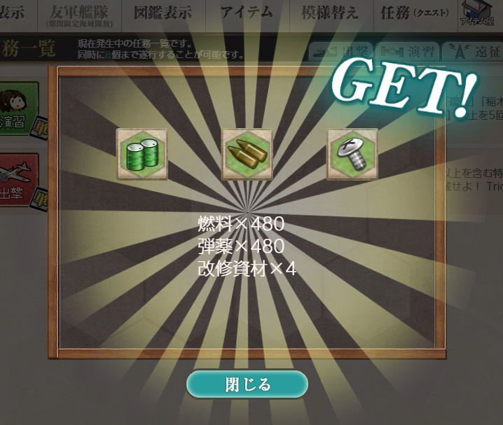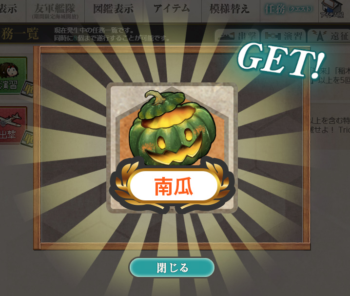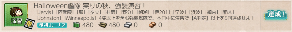 艦これ 任務 「Halloween艦隊 実りの秋、強襲演習!」【期間限定/演習/単発】 Posted on 2025年9月30日2025年11月9日 by miyagi 2025年9月26日実装の期間限定の週間任務です 南瓜任務です 任務内容 ジャービス、阿武隈、朧、夕立、村雨、野分、朝潮、伊201、早波、鵜来、稲木、ジョンストン、ミネアポリスのうち4隻を含む艦隊で 同日中に演習でA勝利以上を5回達成する 任務報酬 燃料×480、弾薬×480、鋼材×0、ボーキサイト×0 給料艦「間宮」 or 高速建造剤×6 or 改修資材×4 南瓜 or 燃料×4200 or ボーキサイト×2700 改修資材と南瓜をいただきました 以下スクショ