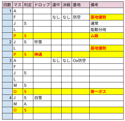 start1 → A → F → J(警戒陣) → L → P(単縦陣)