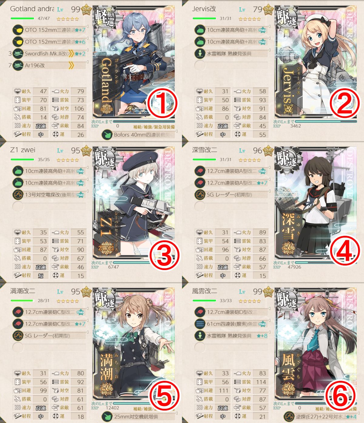 第一の駆逐艦さんたちは道中PTマス対策で小口径主砲や機銃、見張り員を装備しています