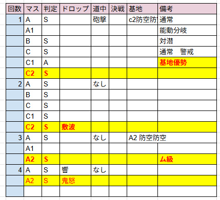 start1 → A(警戒) → A1 → B(警戒陣) → C(警戒陣) → C1(輪形陣) → C2(単縦陣)