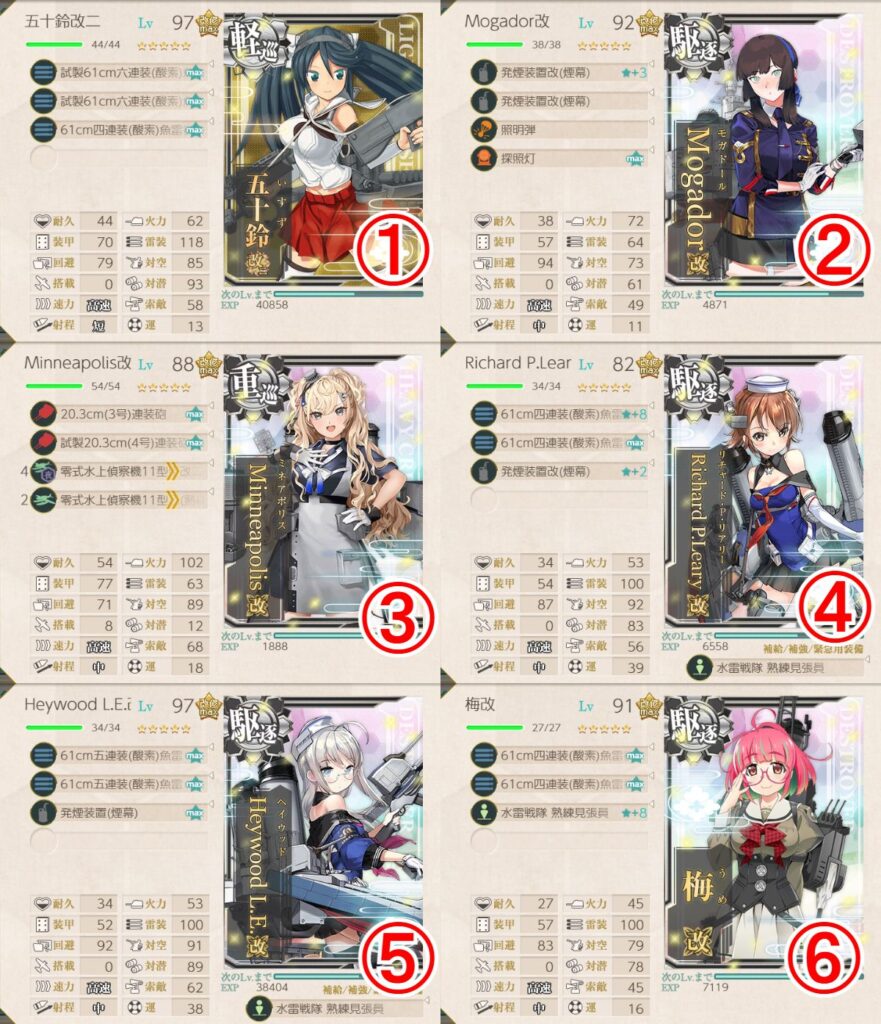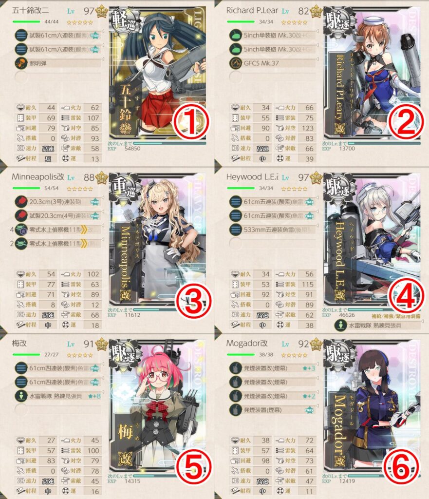 五十鈴さん、ヘイウッドさん、梅さん:魚雷カットイン装備です。おまけで夜戦装備などいれてます