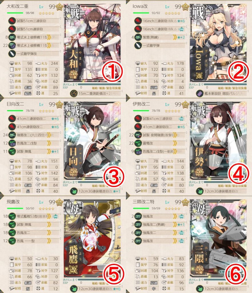 削りで使用した艦に加えて、軽空母枠で制空値稼ぎのために飛鷹さんを採用しています