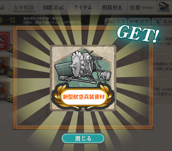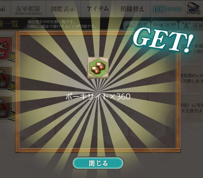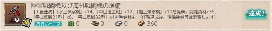 艦これ 任務「陸軍戦闘機及び海外戦闘機の増備」【工廠/単発】 Posted on 2026年4月7日2026年4月7日 by miyagi 2025年6月27日に実装された単発任務です 任務内容 開発資材×36、零式艦戦21型×8、零式艦戦32型×4を準備し、 水上偵察機×14、中口径主砲×12、艦上爆撃機×10を廃棄する ※装備等は任務達成時使用します 任務報酬 ボーキサイト×360 三式戦 飛燕×2 or Sptfire mk.Ⅰ or 二式複戦 屠龍×2 三式戦 飛燕×2 or Sptfire Mk.Ⅰ or 新型航空兵装資材×1 スピットファイアと航空兵装資材をいただきました 以下スクショ