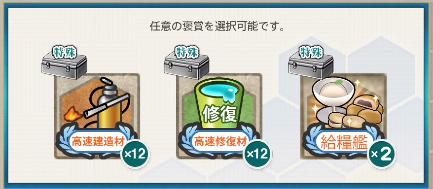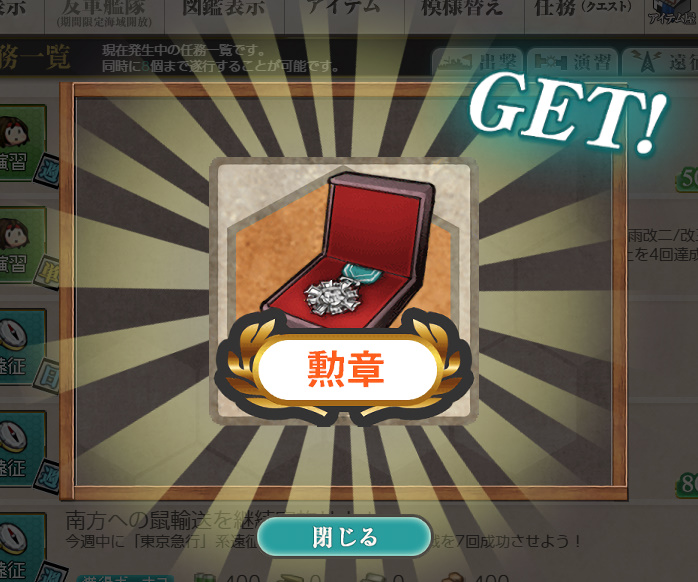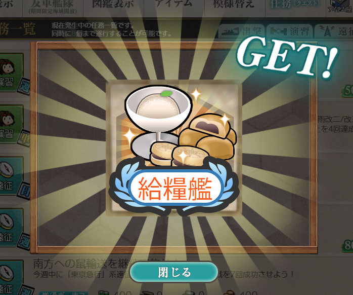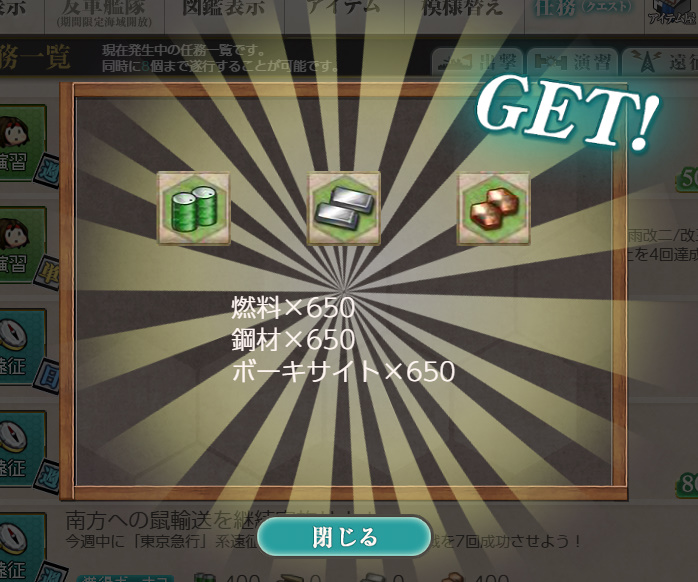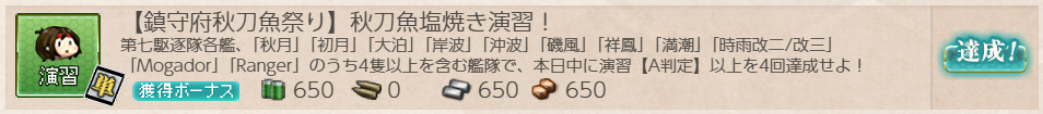 艦これ 任務 「【鎮守府秋刀魚祭り】秋刀魚塩焼き演習!」【期間限定/演習/単発】 Posted on 2026年4月7日 by miyagi 2025年11月10日実装の任務です 任務内容 朧、曙、潮、漣、秋月、初月、大泊、岸波、沖波、磯風、祥鳳、 満潮、時雨改二/改三、モガドール、レンジャー のうち4隻を含む艦隊で 同日中に演習でA勝利以上を4回達成する 任務報酬 燃料×650、弾薬×0、鋼材×650、ボーキサイト×650 給糧艦「伊良湖」×2 or 勲章×1 or 戦闘糧食★+3 高速券造材×12 or 高速修復材×12 or 給糧艦「間宮」×2 勲章と間宮さんをいただきました 以下スクショ