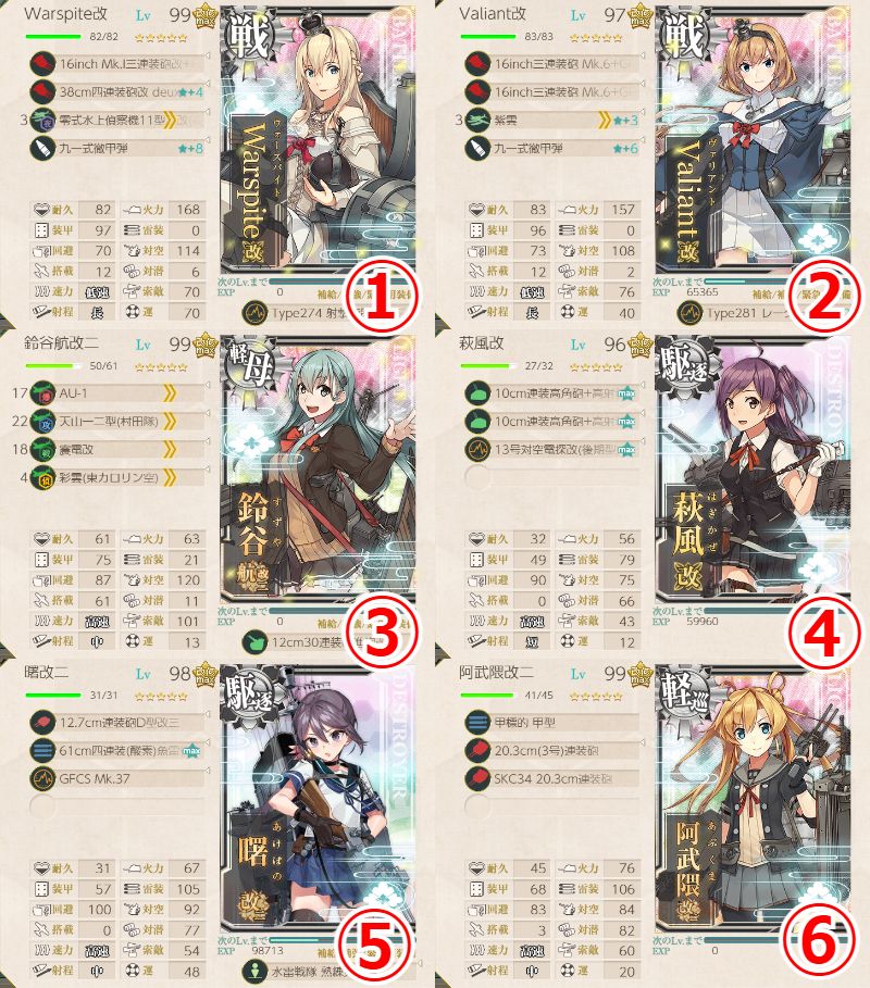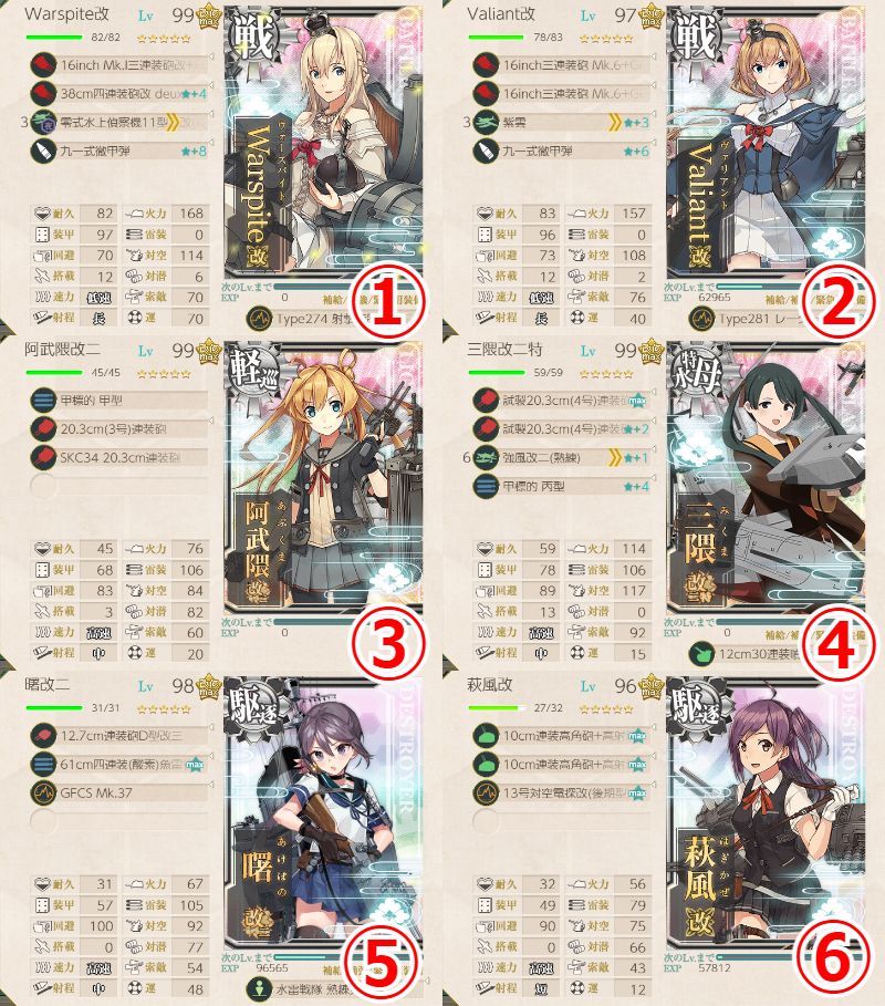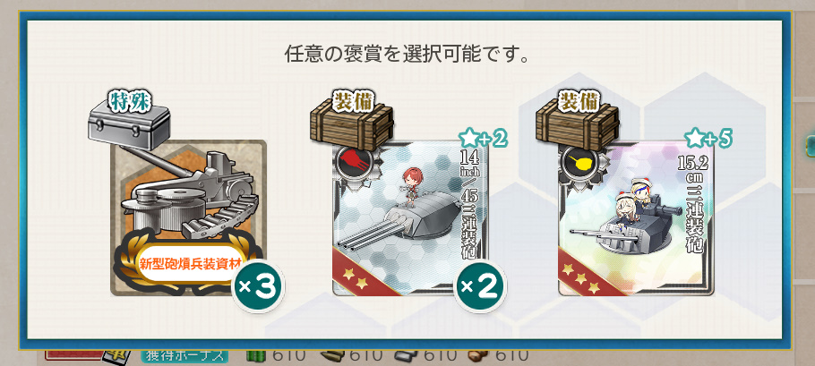 - 新型砲熕兵装資材×3 or 14inch/45三連装砲★+2×2 or 15.2cm三連装砲★+5