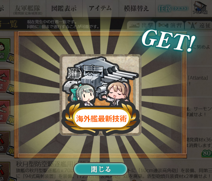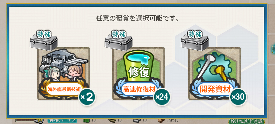 - 海外艦最新技術×2 or 高速修復材×24 or 開発資材×30