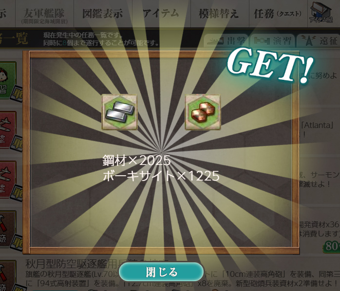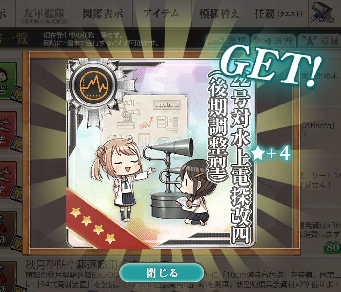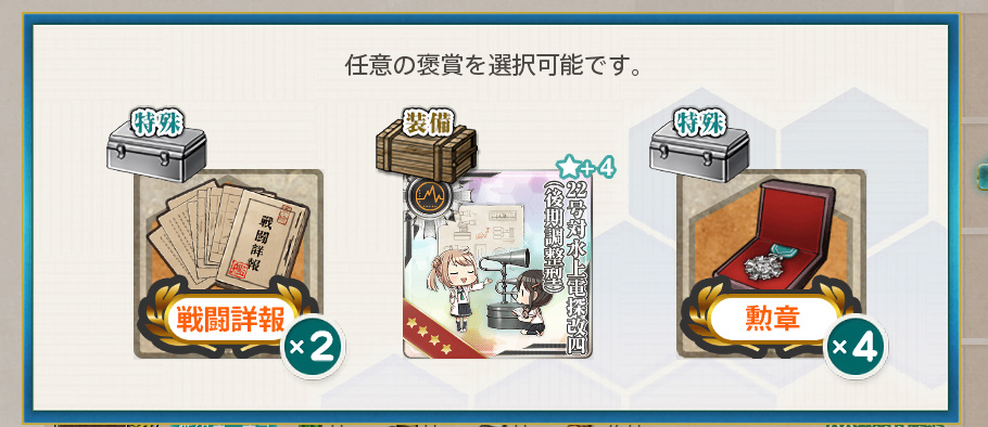 - 戦闘詳報×2 or 22号対水上電探改四(後期調整型)★+4 or 勲章×4