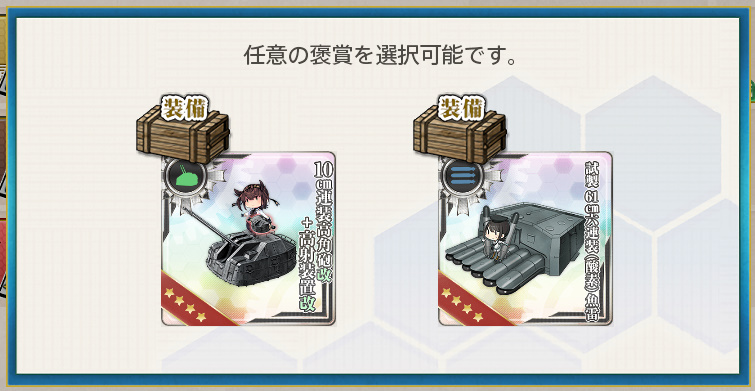 - 10cm連装高角砲改+高射装置改 or 試製61cm六連装(酸素)魚雷