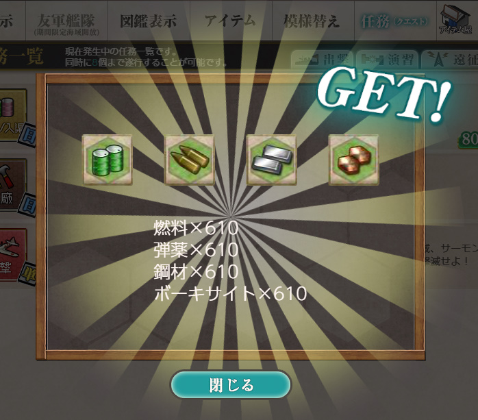 - 燃料×610、弾薬×610、鋼材×610、ボーキサイト×610