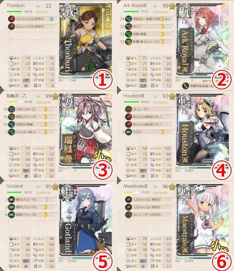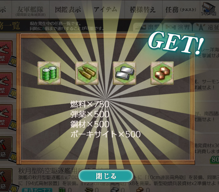 - 燃料×750、弾薬×500、鋼材×500、ボーキサイト×500