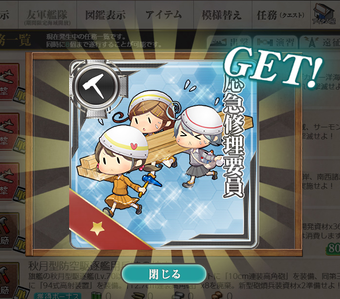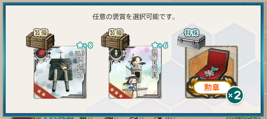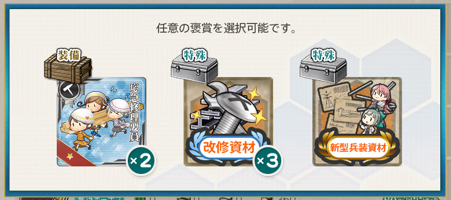 - 応急修理要員×2 or 改修資材×3 or 新型兵装資材×1