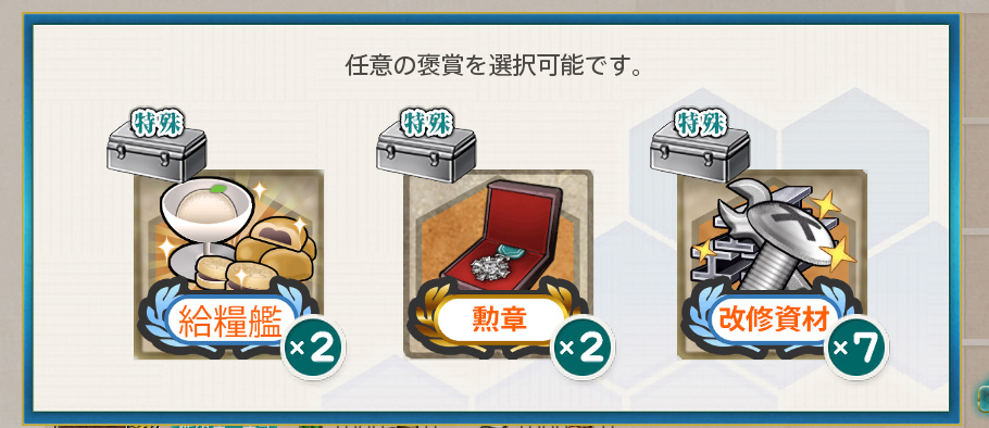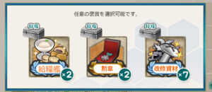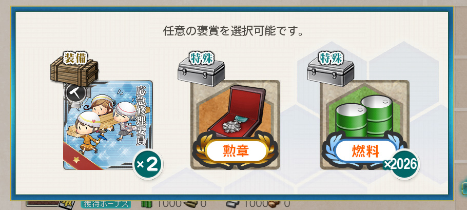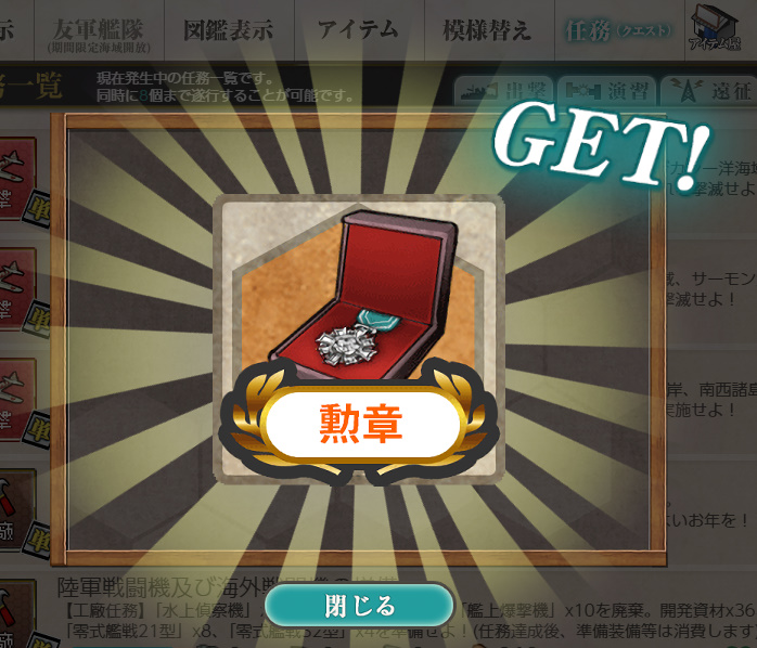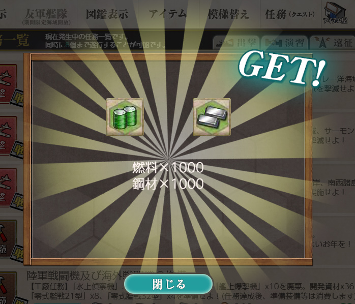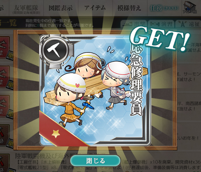 艦これ 任務「【年末年始】鎮守府大掃除!良いお年を!」【工廠/単発】 Posted on 2026年4月10日 by miyagi 2025年12月27日に実装された単発任務です 任務内容 九六式艦戦×8、九四式爆雷投射機×5、鋼材2025を準備し、 小口径主砲×11、中口径主砲×11、水上偵察機×11を廃棄する ※装備等は任務達成時使用します 任務報酬 燃料×1000、鋼材×1000 応急修理要員×2 or 勲章×1 or 燃料×2026 給糧艦「間宮」×2 or 勲章×2 or 改修資材×7 応急修理要員と勲章をいただきました 以下スクショ