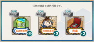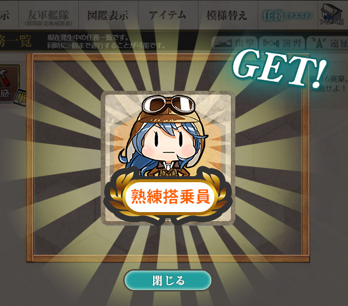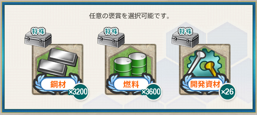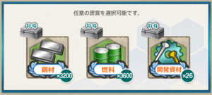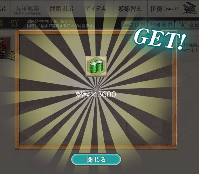 艦これ 任務「【年末年始】拡張大掃除&特別資源輸出-Ⅰ」【工廠/単発】 Posted on 2026年4月10日2026年4月10日 by miyagi 2025年12月27日に実装された単発任務です 任務内容 発煙装置(煙幕)×5、家具箱(小)×25、弾薬2025を準備し、 艦上爆撃機×8、艦上攻撃機×8、魚雷×16を廃棄する ※装備等は任務達成時使用します 任務報酬 鋼材×3200 or 燃料×3600 or 開発資材×26 高速修復材×30 or 熟練搭乗員×3 or 勲章2 燃料と熟練搭乗員をいただきました 以下スクショ