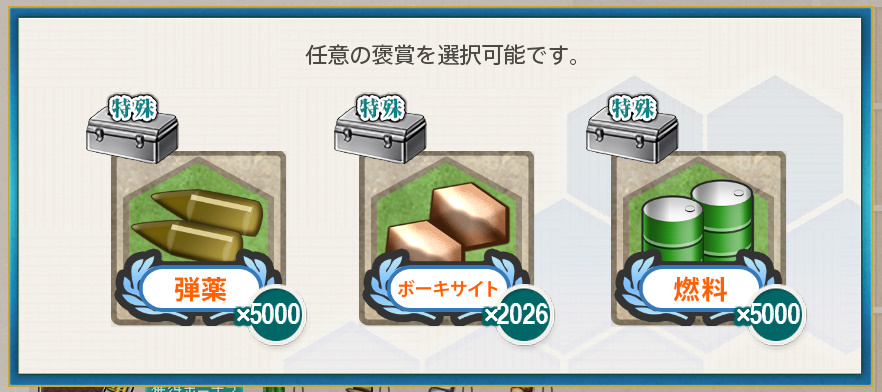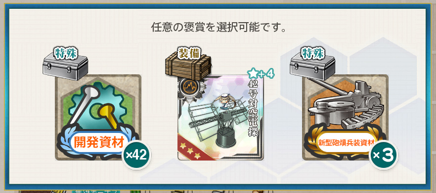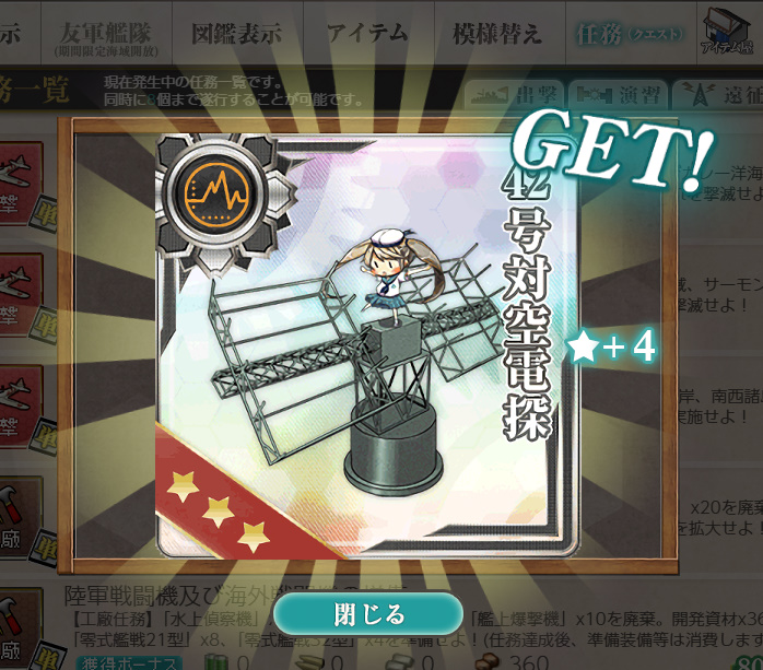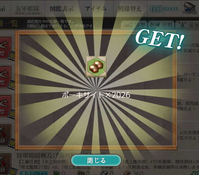 艦これ 任務「【年末年始】拡張大掃除&特別資源輸出-Ⅱ」【工廠/単発】 Posted on 2026年4月10日 by miyagi 2025年12月27日に実装された単発任務です わりにあわない任務として話題になっていた気が… まあやるんですけれども自分は 任務内容 13号対空電探×8、21号対空電探×4、鋼材×2025を準備し、 大口径主砲×8、中口径主砲×16、水偵×20を廃棄する ※装備等は任務達成時使用します 任務報酬 弾薬×5000 or ボーキサイト×2026 or 燃料×5000 開発資材×42 or 42号対空電探★+4 or 新型砲熕兵装資材×3 ボーキサイトと電探をいただきました 以下スクショ