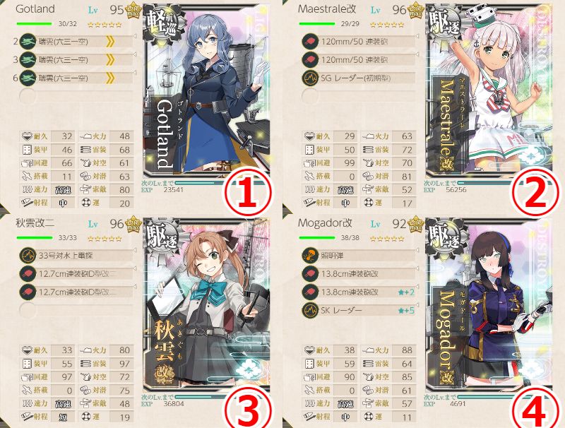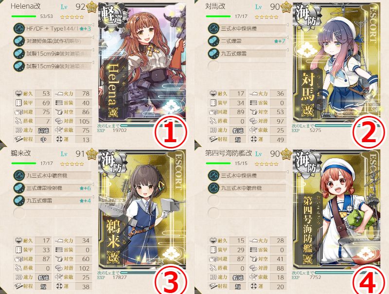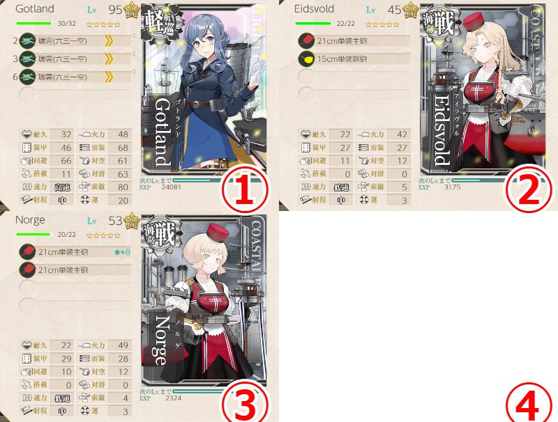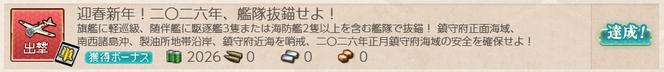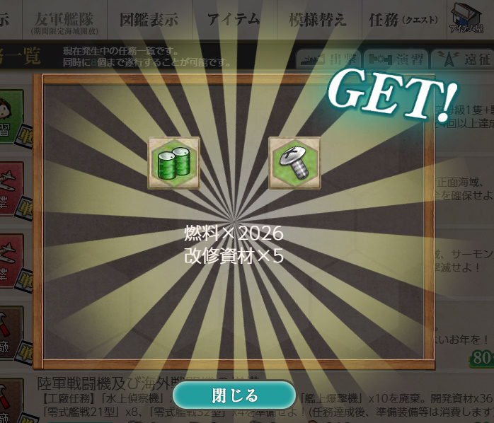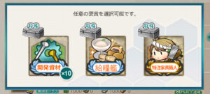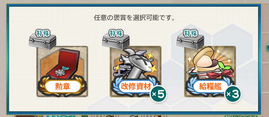 - 勲章×1 or 改修資材×5 or 給糧艦「伊良湖」×3