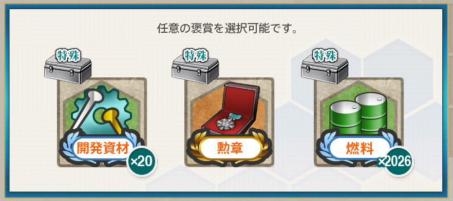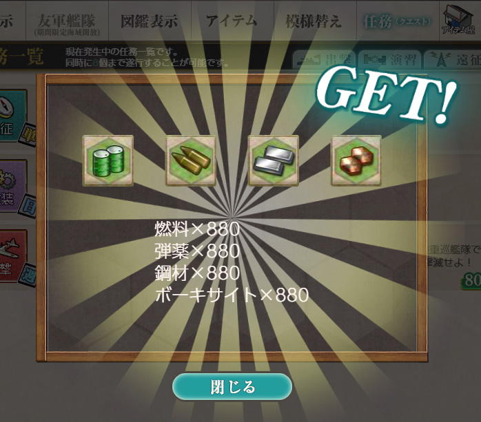 - 燃料×880、弾薬×880、鋼材×880、ボーキサイト×880