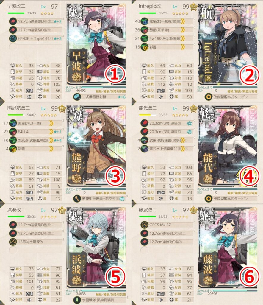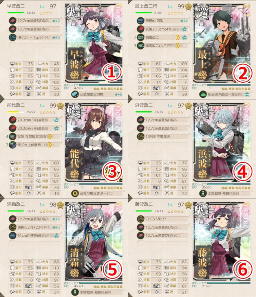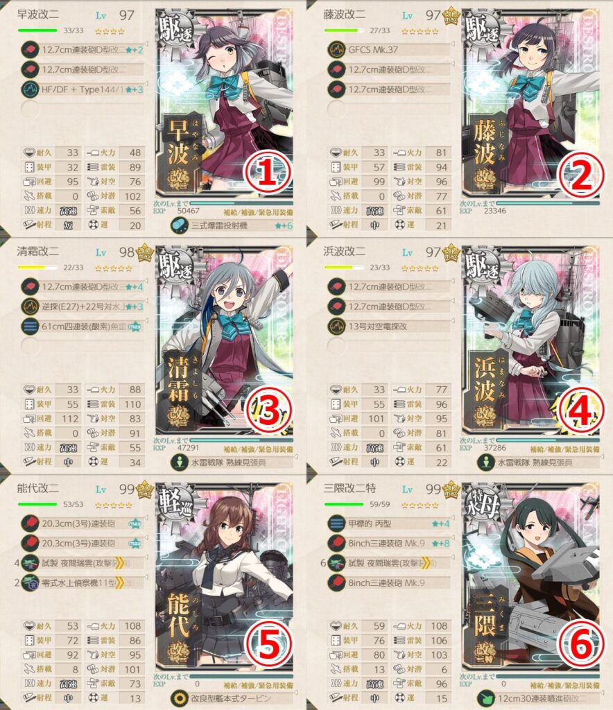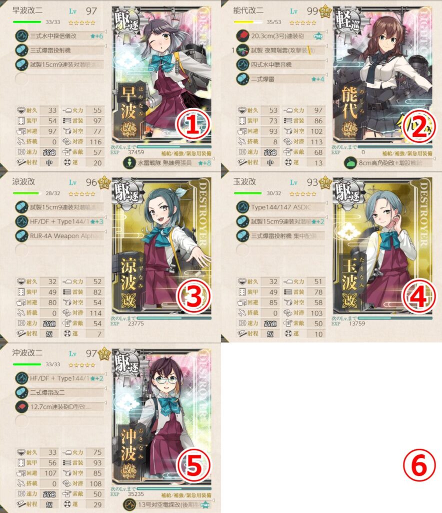 - 四式水中聴音機★+2 or 逆単(E27)+22号対水上電探改四(後期調整型) or 12.7cm連装砲D型改三