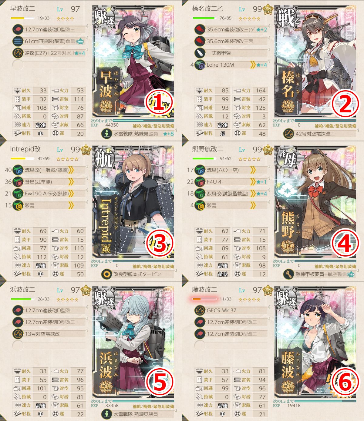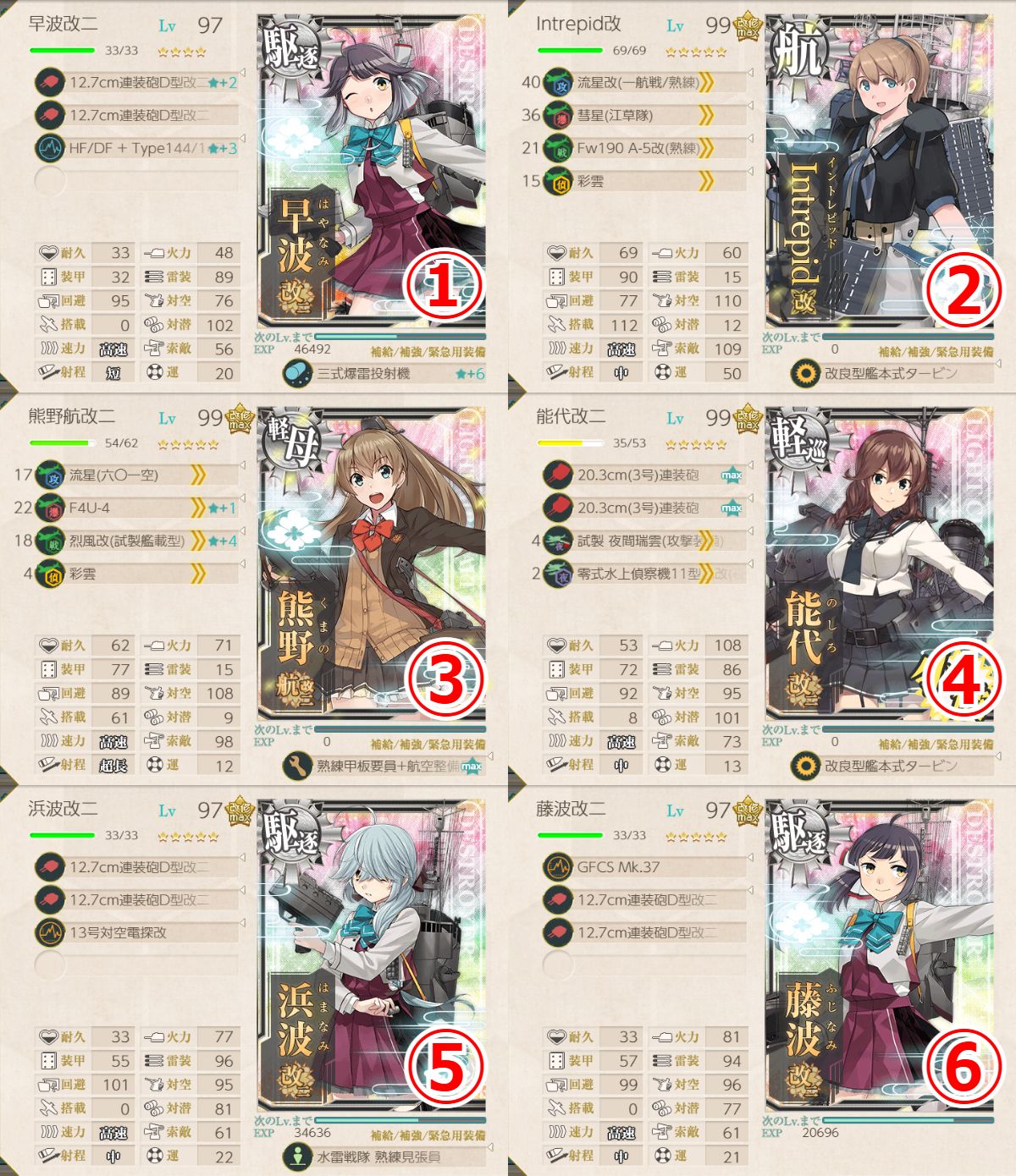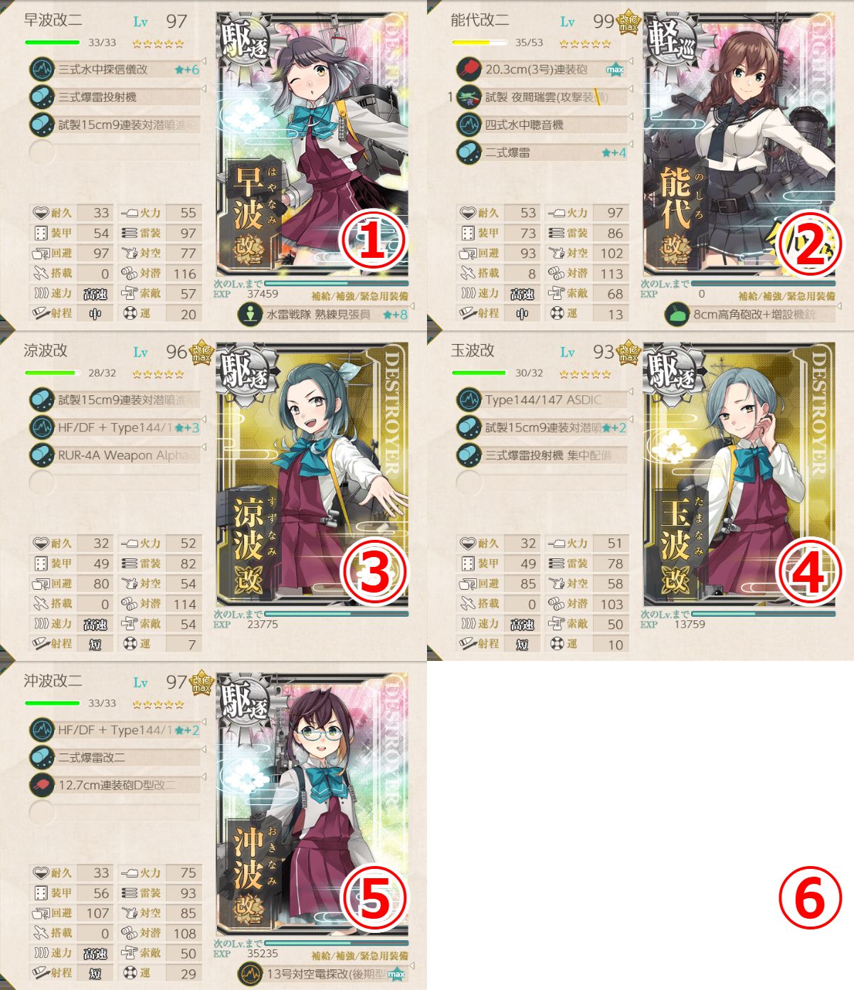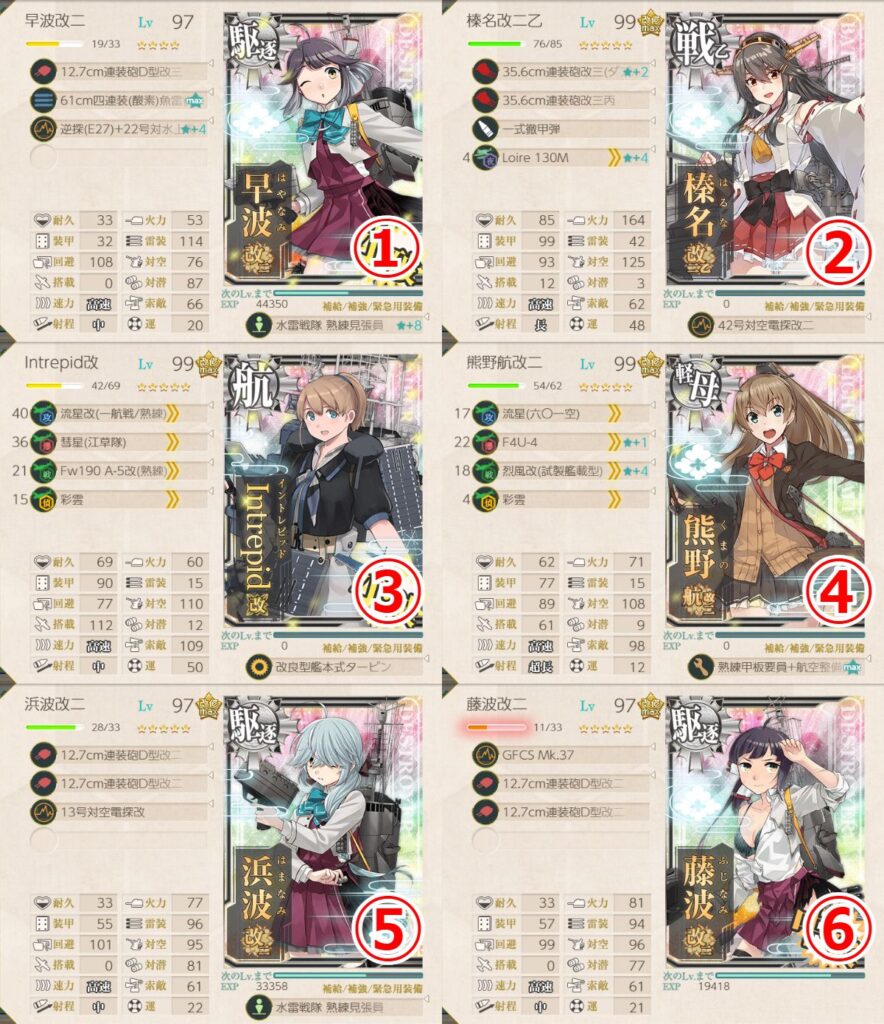 - 四式水中聴音機★+2 or 逆単(E27)+22号対水上電探改四(後期調整型) or 12.7cm連装砲D型改三
