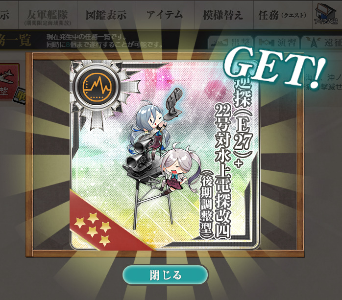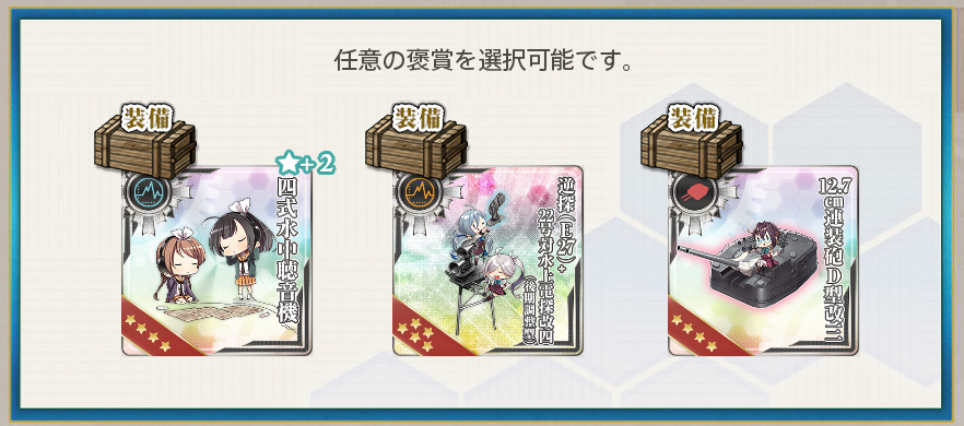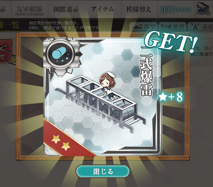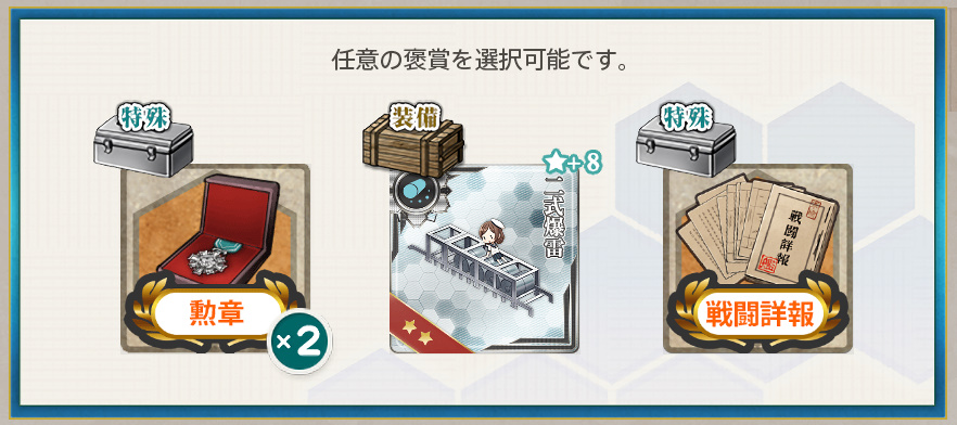 - 勲章×2 or 二式爆雷★+8 or 戦闘詳報