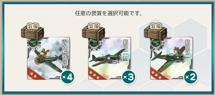 - 零式艦戦52型×4 or 紫電一一型×3 or 紫電改二×2