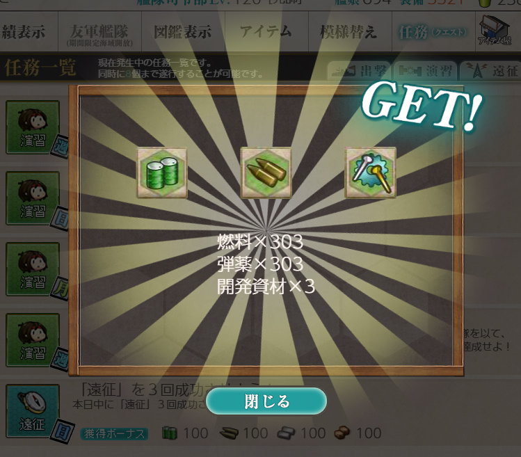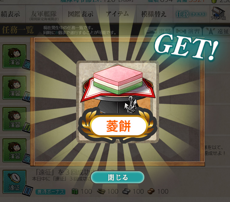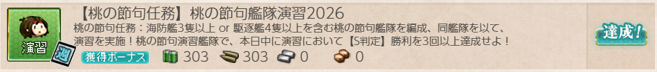 艦これ 任務 「【桃の節句任務】桃の節句艦隊演習2026」【期間限定/演習/ウィークリー】 Posted on 2026年4月14日2026年4月14日 by miyagi 2026年3月2日実装の任務です ヴァレンタインVS桃の節句 任務内容 海防艦を三隻以上 または 駆逐艦を4隻以上 含む艦隊で 同日中に演習でS勝利以上を3回達成する 任務報酬 燃料×303、弾薬×303 開発資材×3 or 高速修復材×3 菱餅×1 基本開発資材をいただいてたと思います 以下スクショ