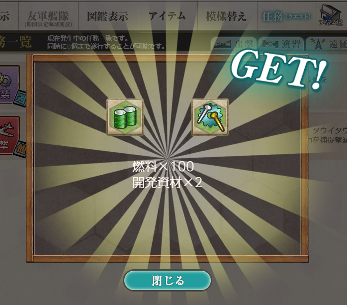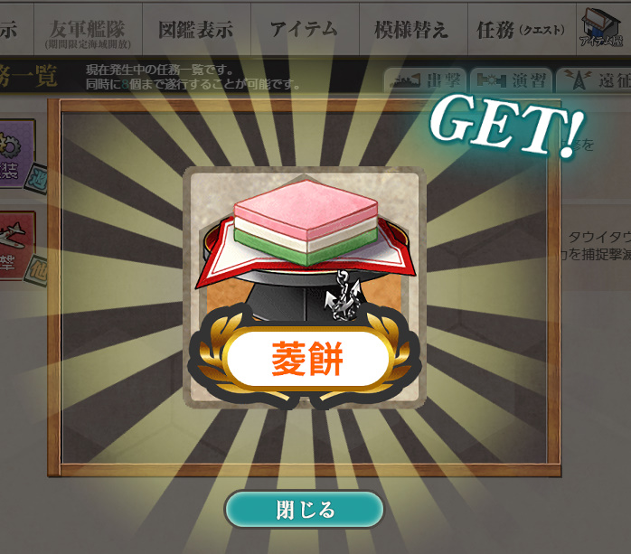 艦これ 任務 「【桃の節句任務】駆逐艦桃の節句改修」【期間限定/近代化改修/ウィークリー】 Posted on 2026年4月14日2026年4月14日 by miyagi 2026年3月2日実装の任務です サムネは大変もったいない画像です 川内型は…とっておけ…! 任務内容 鋼材×303、ボーキサイト×303を準備し、 任意の駆逐艦の近代化改修を軽巡洋艦3隻により2回成功させる 任務報酬 燃料×100 開発資材×2、菱餅×1 以下スクショ