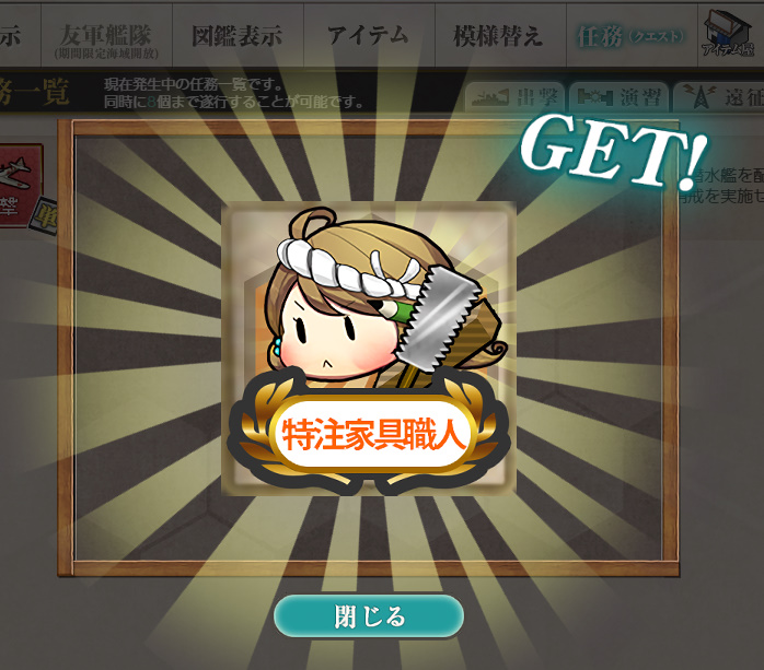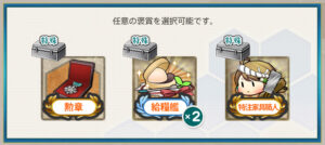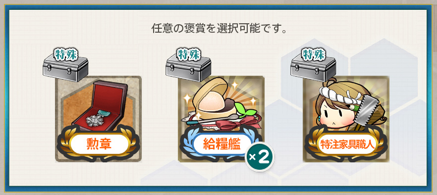 - 勲章 or 給糧艦「伊良湖」×2 or 特注家具職人