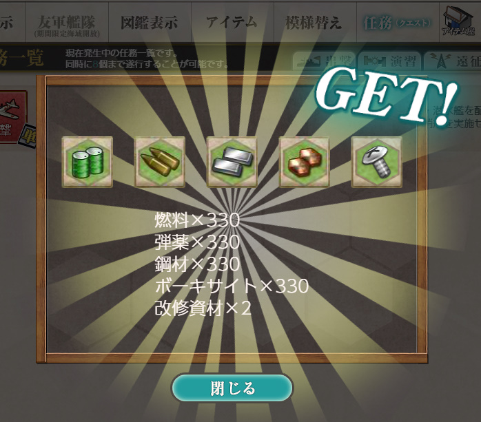 - 燃料×330、弾薬×330、鋼材×330、ボーキサイト×330