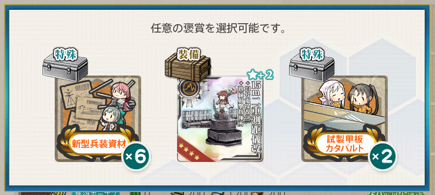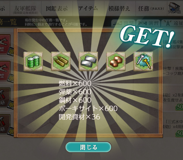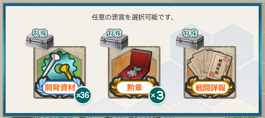 - 開発資材×36 or 勲章×3 or 戦闘詳報
