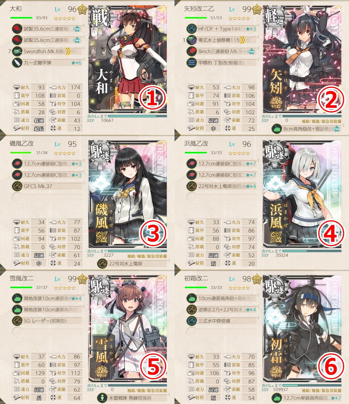 他随伴艦として磯風、浜風、雪風、冬月、涼月、霞、初霜、朝霜から4隻を編成して