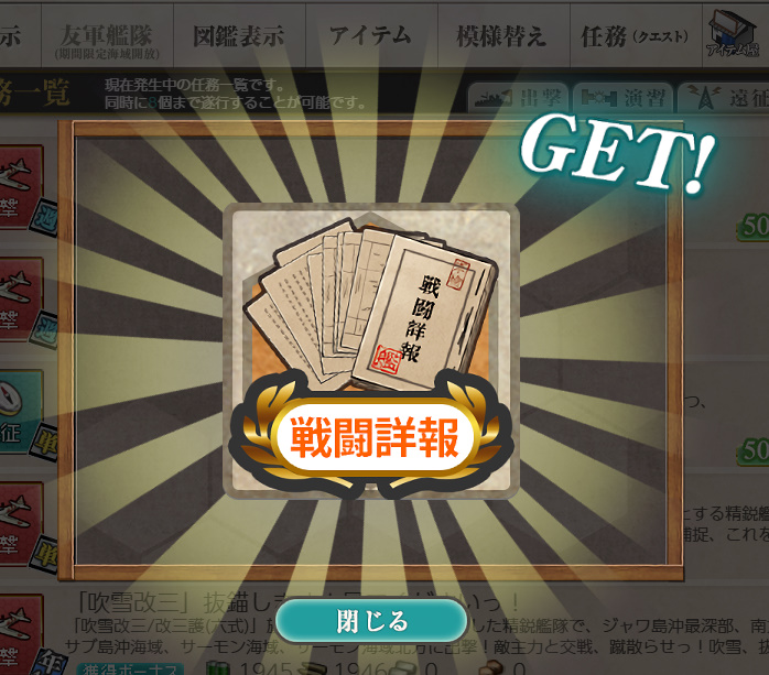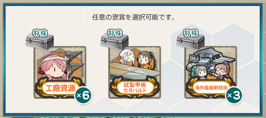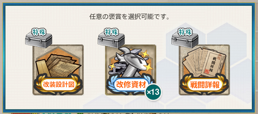 - 改装設計図 or 改修資材×13 or 戦闘詳報
