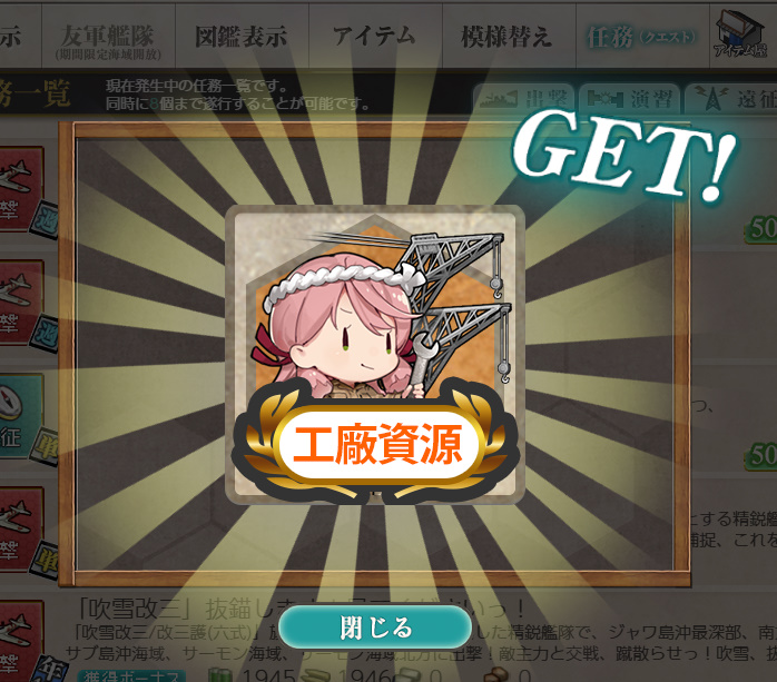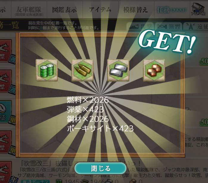 - 燃料×2026、弾薬×423、鋼材×2026、ボーキサイト×423