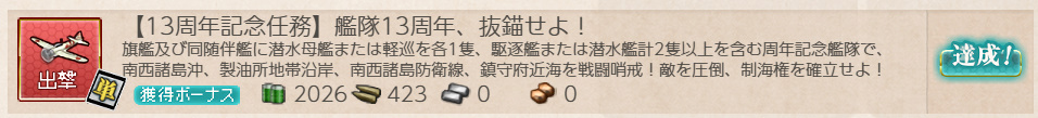 艦これ 任務 「【13周年記念任務】艦隊13周年、抜錨せよ!」【期間限定/出撃/単発】