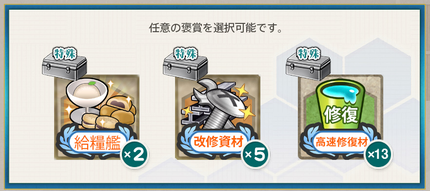 - 給糧艦「間宮」×2 or 改修素材×5 or 高速修復材×13