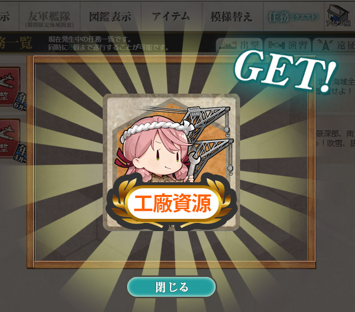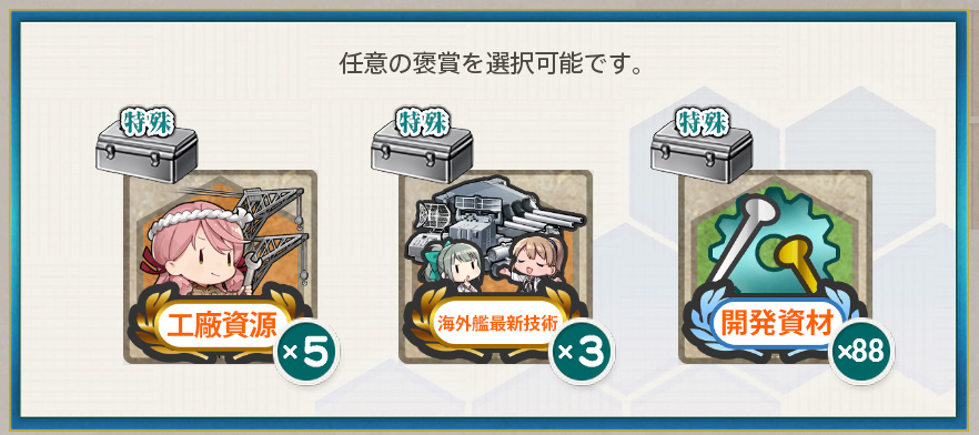 - 工廠資源×5 or 海外艦最新技術 or 開発資材×88