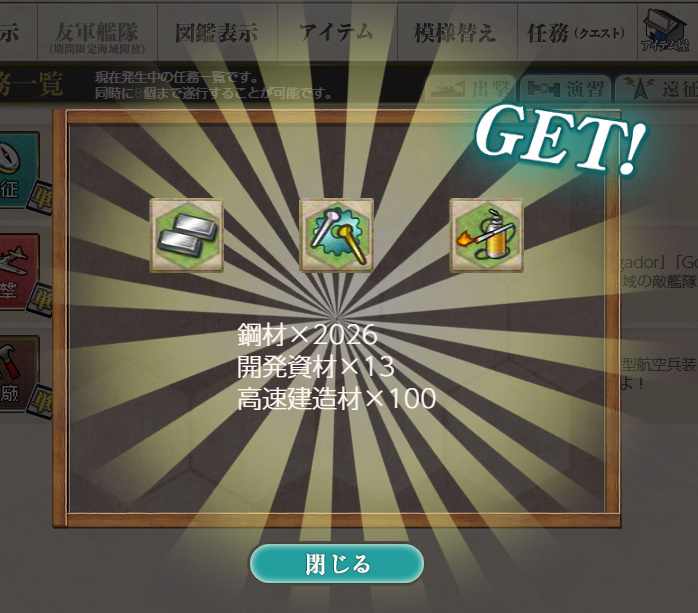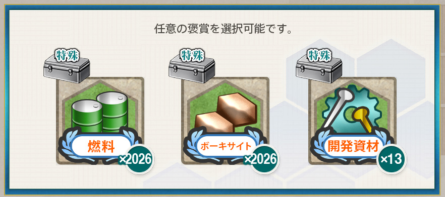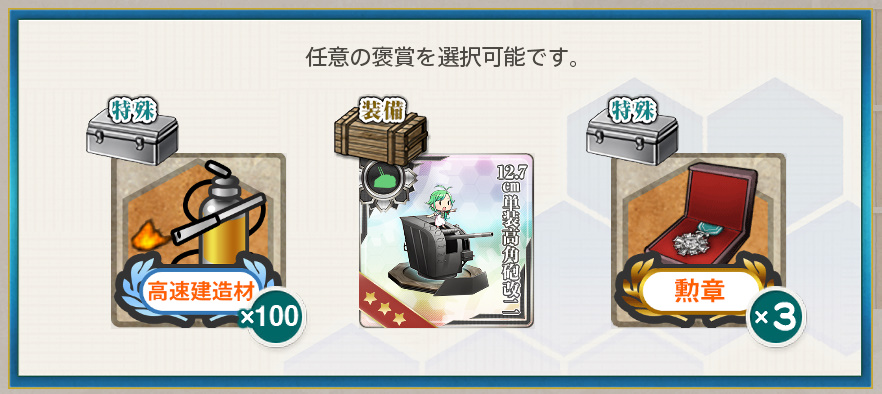 - 高速建造材×100 or 12.7cm単装高角砲改二 or 勲章×3