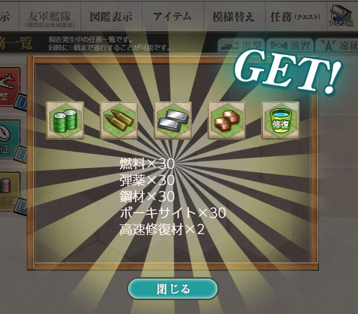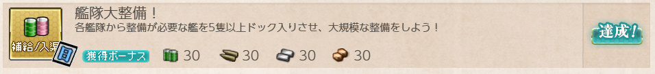 - 報酬:燃料×30、弾薬×30、鋼材×30、ボーキサイト×30、高速修復材×2